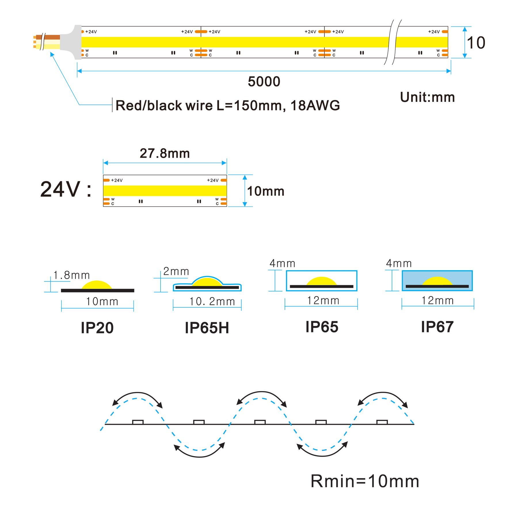 Ширина LED ленты 10 мм, кратность резки 27,8 мм.