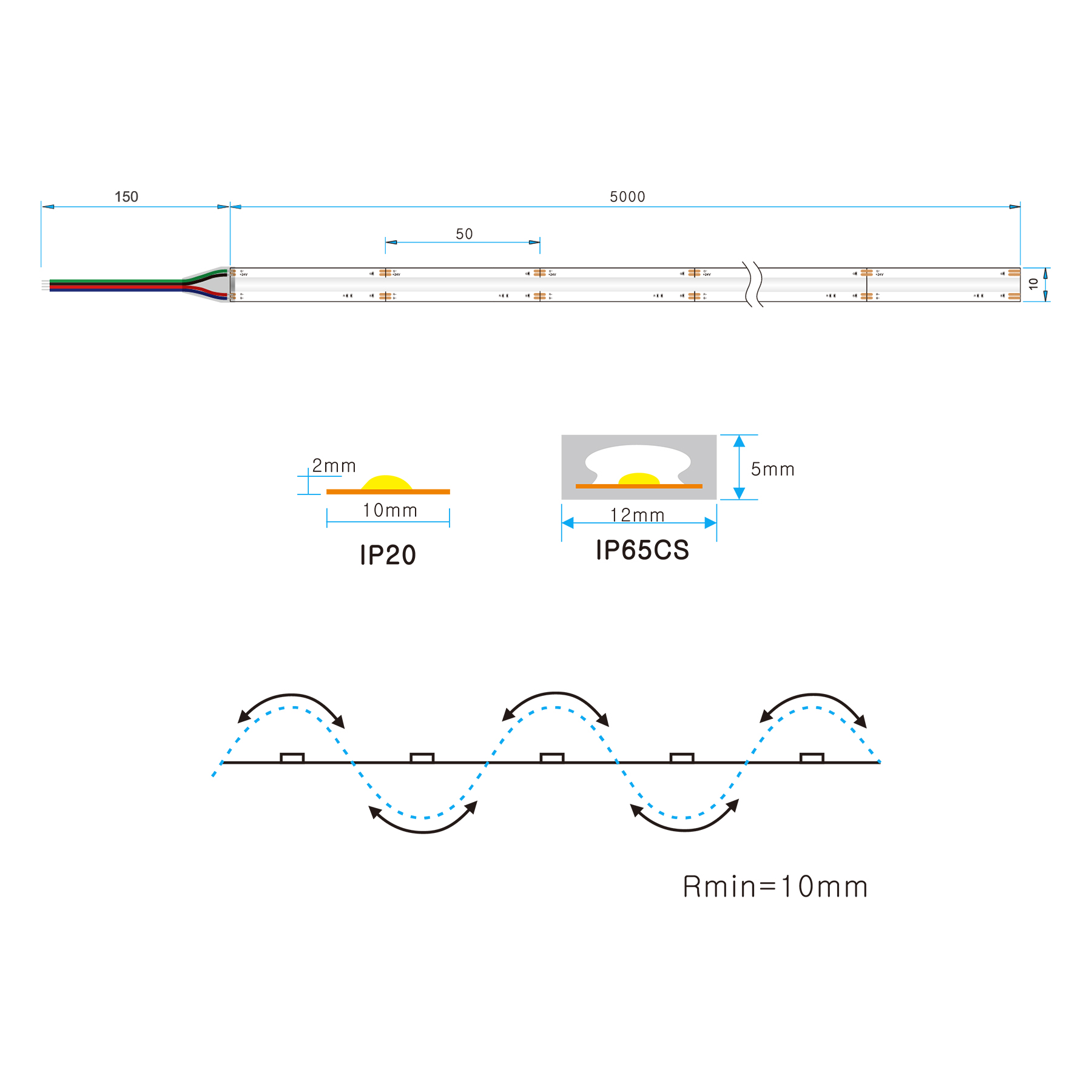 Ширина LED ленты 10 мм, кратность резки 50 мм.