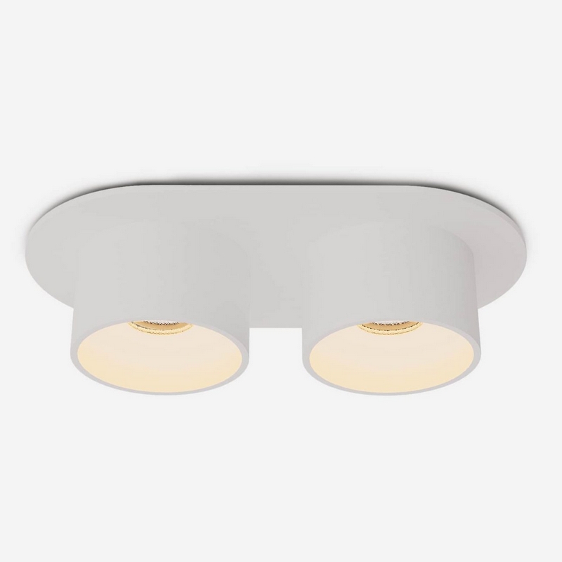Roll80 in 1/2 Duo 24W — это мощный встроенный светильник с двумя источниками света по 12w каждый. Благодаря общей мощности 24w и углу свечения 50°, он идеально подходит для создания основного освещения в помещениях с высокими потолками. Светильник частично утоплен в гипсокартон, что придаёт ему аккуратный, современный вид.