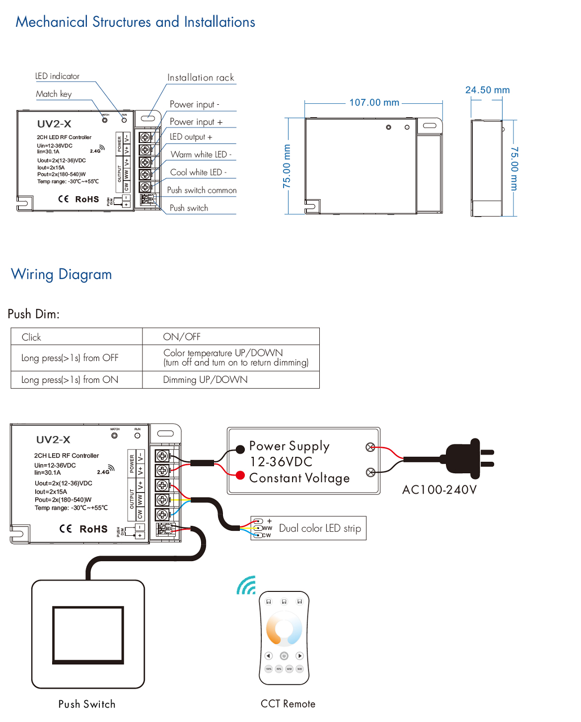 Контроллер мультибелой светодиодной ленты MIX (ШИМ). Питание/рабочее напряжение 12-36VDC, максимальный ток 15A на канал, 2 канала, максимальная мощность 360-1080W. Винтовые клеммы. Корпус - металл. Габариты 107x75x24.5 мм. Управляется пультами и панелями, а так же звонковой кнопкой Push DIM.