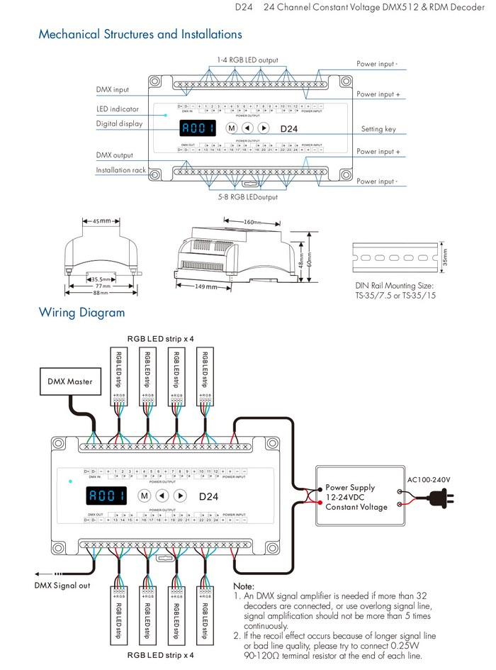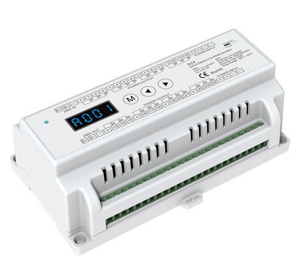 Декодер DMX512 для трансляции DMX512 сигнала ШИМ(PWM) устройствам. Питание 12-24VDC. 24 канала, ток нагрузки 24x3A, мощность нагрузки 864-1720W. Входной сигнал DMX512, выходной сигнал ШИМ(PWM). Цифровой дисплей на корпусе, адрес устанавливается с помощью кнопок. Декодер предназначен для установки на DIN-рейку. Размер 160x88x60 мм.