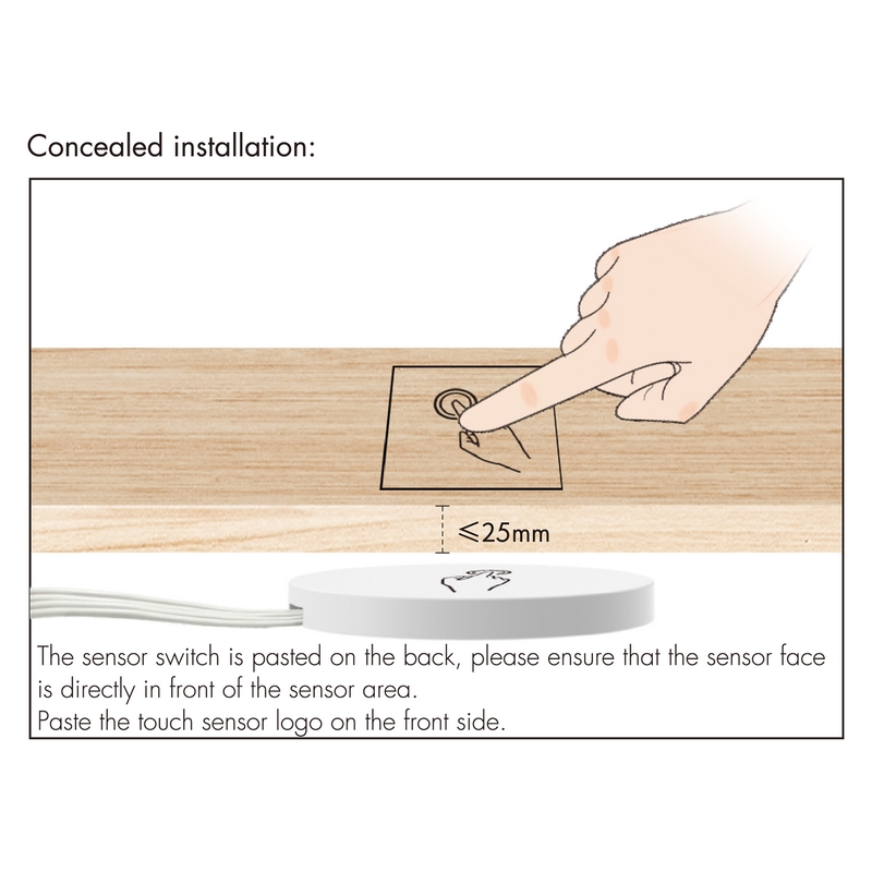 Контактный сенсорный датчик может срабатывать без прикосновения через неметаллические материалы, такие как дерево, акрил,пластик и стекло. Низковольтное питание 5 В постоянного тока с выходным сигналом ШИМ 5 В. Работает с контроллерами (a010110, a010126, a010106). Короткое нажатие для включения/выключения света, длительное нажатие для регулировки яркости. 1с затухание света, 2с затухание света. Логарифмические кривые затемнения. Можно установить 2 уровня расстояния срабатывания прикосновения (0-1 см для открытой установки, 3-4 см для скрытой установки). Можно установить 3 уровня выходной частоты ШИМ (500 Гц/2 кГц (по умолчанию)/4 кГц). Сверхтонкая конструкция, нет необходимости прорезать отверстия. Применяется для освещения шкафов, кладовок, винных шкафов и других помещений.