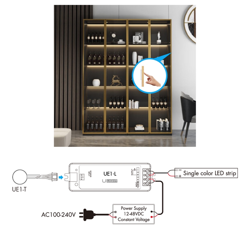 Димер управляемый сенсорными датчиками ( UEB(C), UEW, UED(C)). Работает в диапазоне 12-48VDC. Мощность 8Aх1CH 96W/192W/288W/384W (12V/24V/36V/48V). Возможность увеличения мощности с помощью усилителя (a010007). |