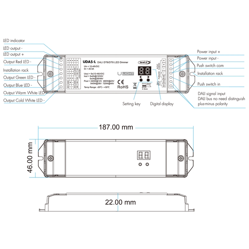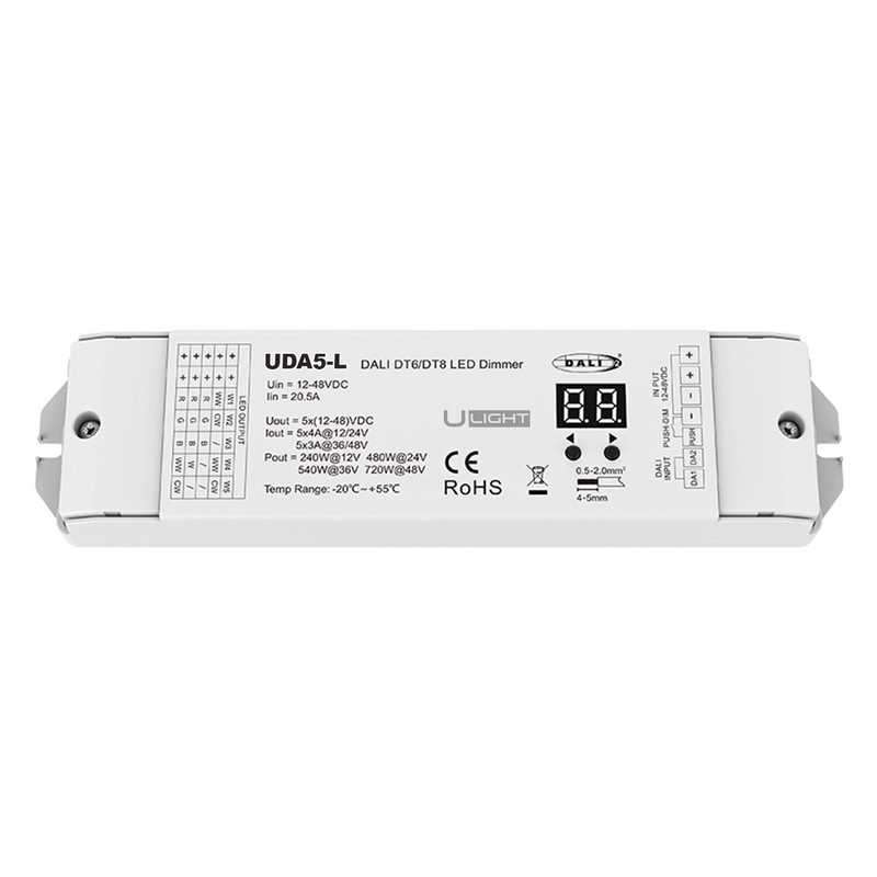 Универсальный многофункциональный 1 адресный диммер. В режиме DALI DT6 можно можно устанавливать количество адресов 1 все выходы работают одновременно синхронно или до 5 раздельных выхода . Регулировка яркости DT6, Цветовая температура DT8-TC/DT8-RGB. / DT8-RGBW / DT8-RGB+CCT светодиодных лент, а также push-switch звонковая кнопка регулировка яркости, цветовой температуры, регулировка цвета . Питание/выход DC 12-48V, ток нагрузки 5x4A@12/24V и 5x3A@36/48V. Частота ШИМ 1000 - 16000 Гц. Защита от перегрева/перегрузки/короткого замыкания, автоматическое восстановление. С функцией быстрого самотестирования