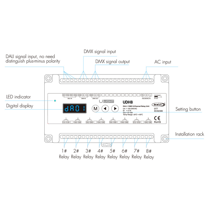 Описание товара "USMART UDH8 Релейный модуль (выключатель) DALI/DMX512/ручной режим"