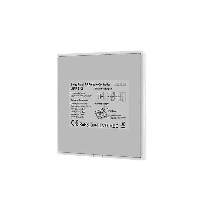 Накладная кнопочная панель 2.4 ГГц, цвет белый. Материал - пластик. Для управления одноцветными источниками света (ШИМ), 2 зоны управления. Питание/рабочее напряжение 3VDC от батарейки CR2032. Габариты 86х86х15 мм. Панель совместима с диммерами серии USMART.