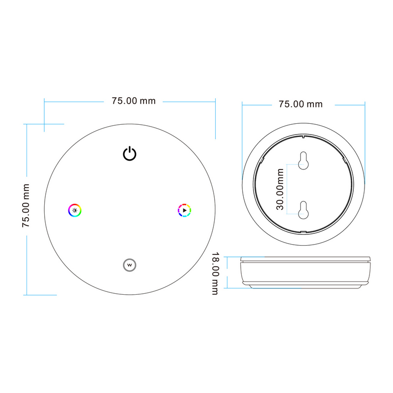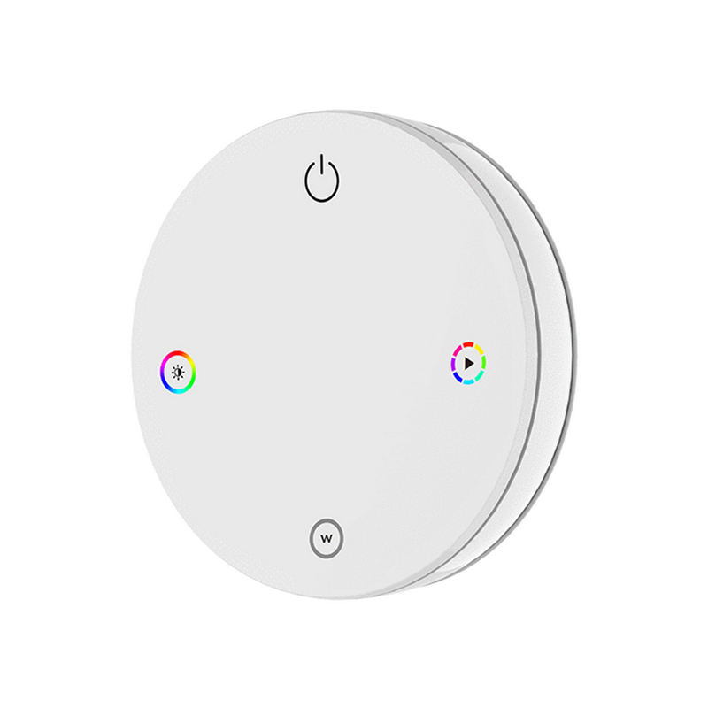 Однозонная накладная панель, пульт 2.4 ГГц, цвет белый. Для управления RGB или RGBW источниками света (ШИМ), Питание/рабочее напряжение 3VDC от батарейки CR2032. Габариты диаметр75мм,толщина 18мм. Панель совместима со всеми радио диммерами и контролерами серии USMART.