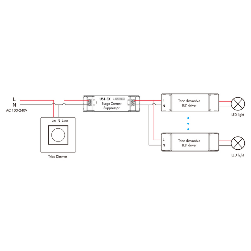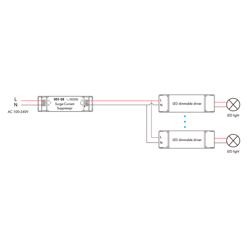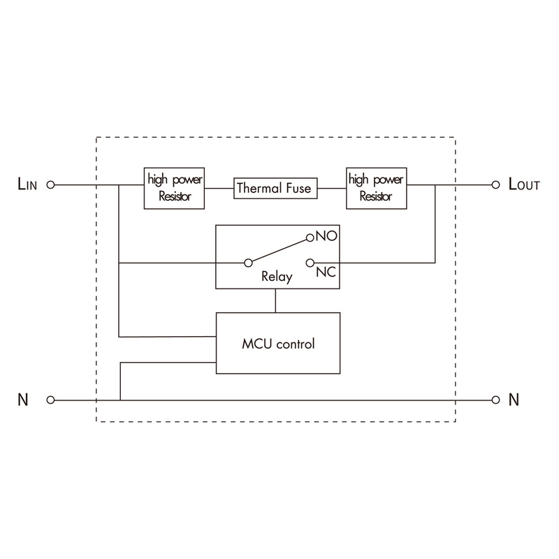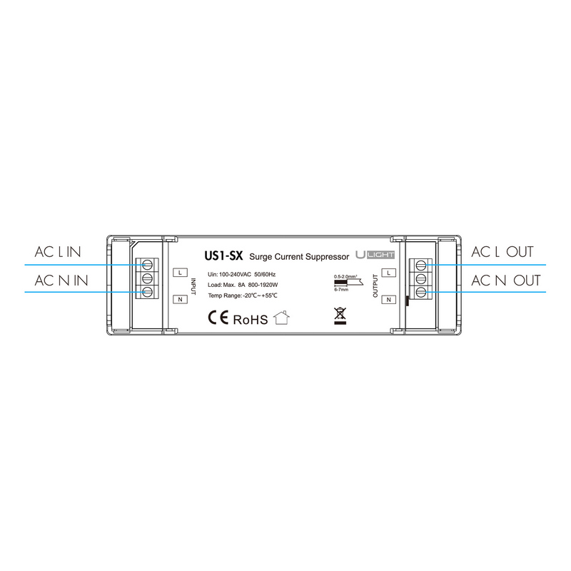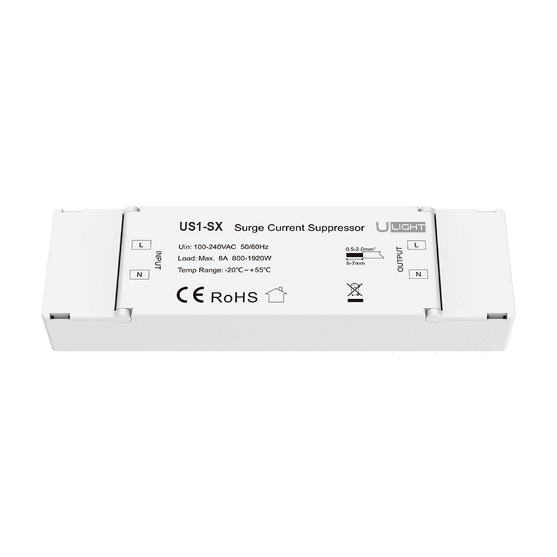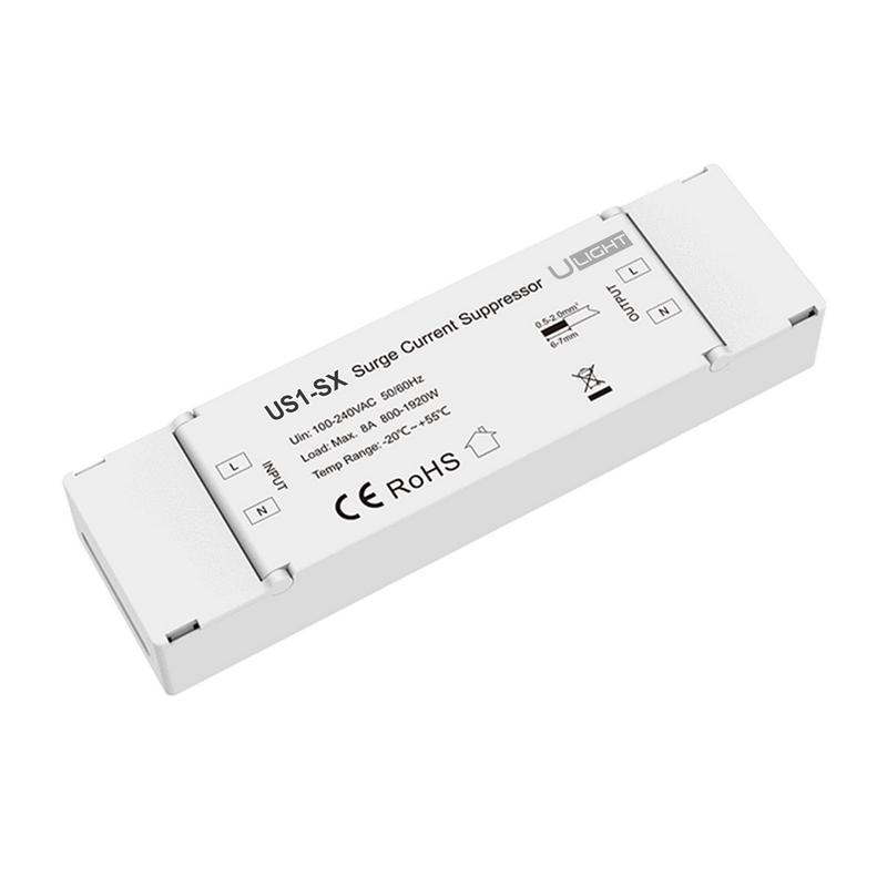 Максимальный рабочий ток составляет 8А, пусковой ток может быть подавлен максимум до 20А. Встроенное байпасное реле. Встроенный термопредохранитель для тепловой защиты. Используется для снижения высокого пускового тока c такими нагрузками, как светодиодные драйверы с регулируемой яркостью и светодиодные лампы с регулируемой яркостью.