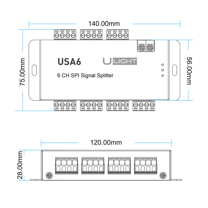 Делитель для SPI контроллеров. Разветвляет и восстанавливает цифровой сигнал на 6 выходов для SPI-лент. Позволяет подключить в 6 раз больше лент к одному SPI контроллеру. Напряжение питания 5-24 B. Размеры 140х70х25 мм.