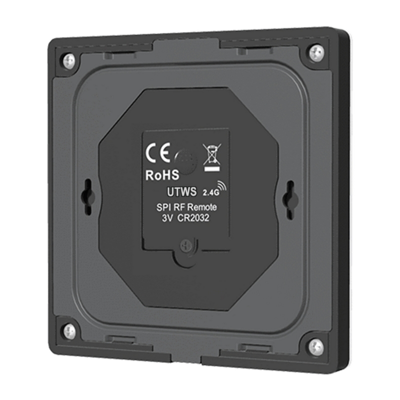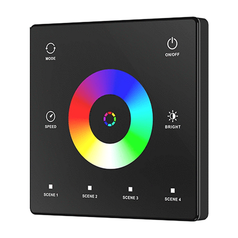 Сверхчувствительная сенсорная панель из высокопрочного стекла используется для светодиодных контроллеров RGB или RGBW SPI. Поддерживает настройку цвета, типа изменения, направления движения, скорости и яркости динамического режима. Встроенная память на 4 сцены. Питание от батарейки CR2032. Сенсорные клавиши с светодиодным индикатором. Доступны белый и черный цвета.