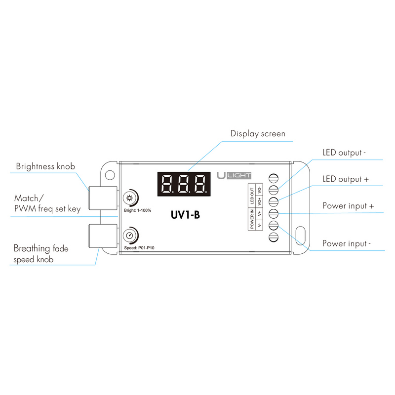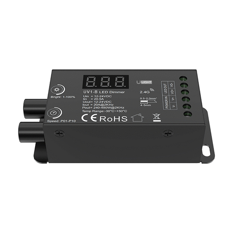 ШИМ диммер для управления одноцветной светодиодной лентой и другими светодиодными источниками света с напряжением питания 12-24В. С возможностью настройки скороти пульсации 1с до 60с. Удобное и точное управление с помощью потенциометра (вращателя) и цифрового дисплея, что позволит легко настроить яркость освещения. Встроенный индикатор перегрузки и перегрева. Настройка частоты ШИМ сигнала 250 Гц - 16 кГц. Устройство совместимо с радиочастотными пультами дистанционного управления и настенными панелями управления серии USMART. Возможна привязка до 10 пультов или панелей управления. Питание от 12-24В, максимальная нагрузка 20А, выходная мощность 240-480 Вт (в зависимости от напряжения питания). Габариты устройства 90x40x28 мм, металлический корпус черного цвета.
